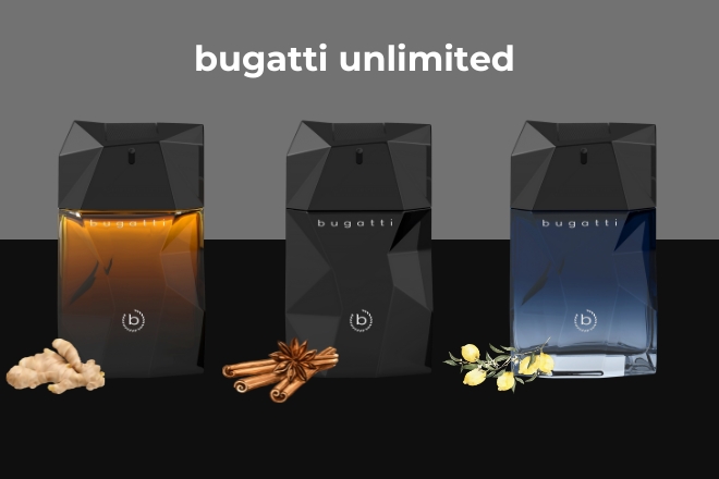 Flakony řady bugatti unlimited jsou ztělesněním originálního designu bez kompromisů a působivé moderní estetiky. Mají nezaměnitelný tvar s asymetricky broušenými plochami, což podtrhuje dynamičnost a osobitost vůní. Sytě černý, lesklý, geometricky tvarovaný uzávěr umocňuje působivý vzhled flakonů a zároveň funguje jako integrovaný rozstřikovač, plynule začleněný do designu s důrazem na intuitivní použití a elegantní řešení. Design promyšleně spojuje estetiku na vysoké úrovni a funkčnost – tím vytváří inovativní dojem, který vyzdvihuje moderně mužný charakter vůní.
